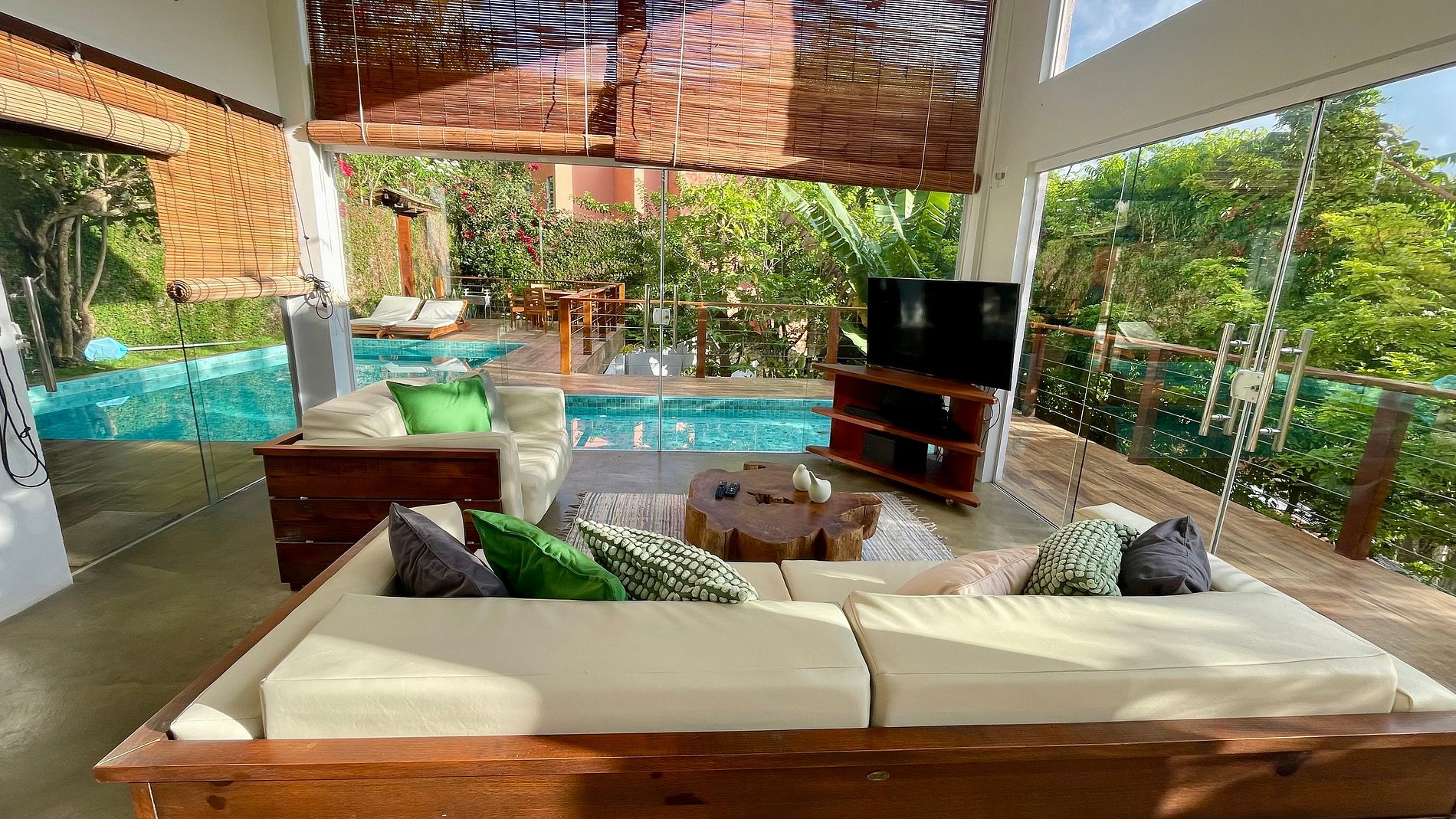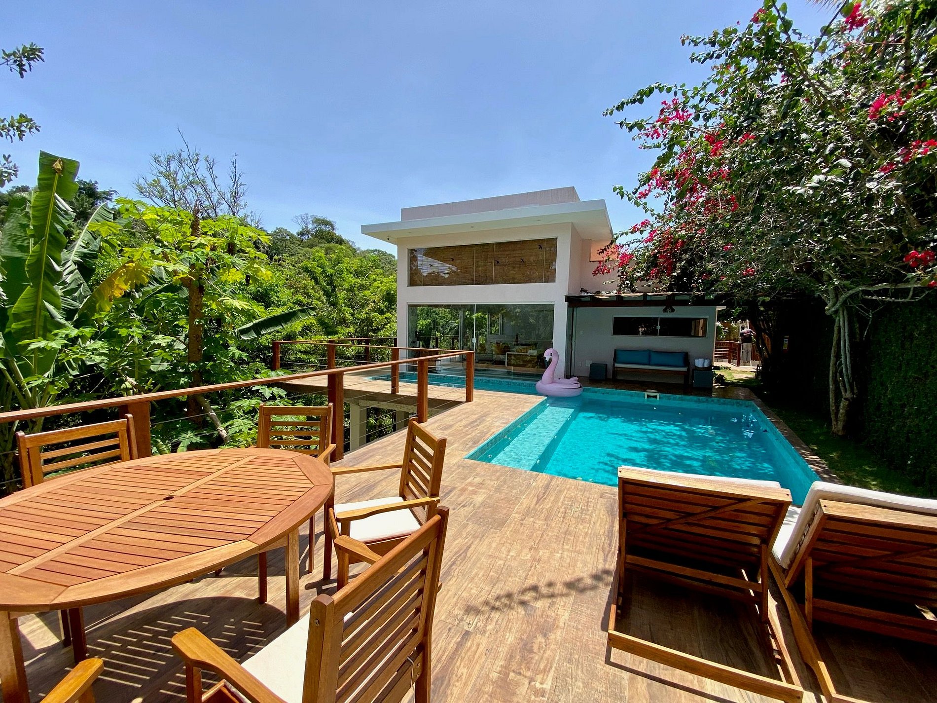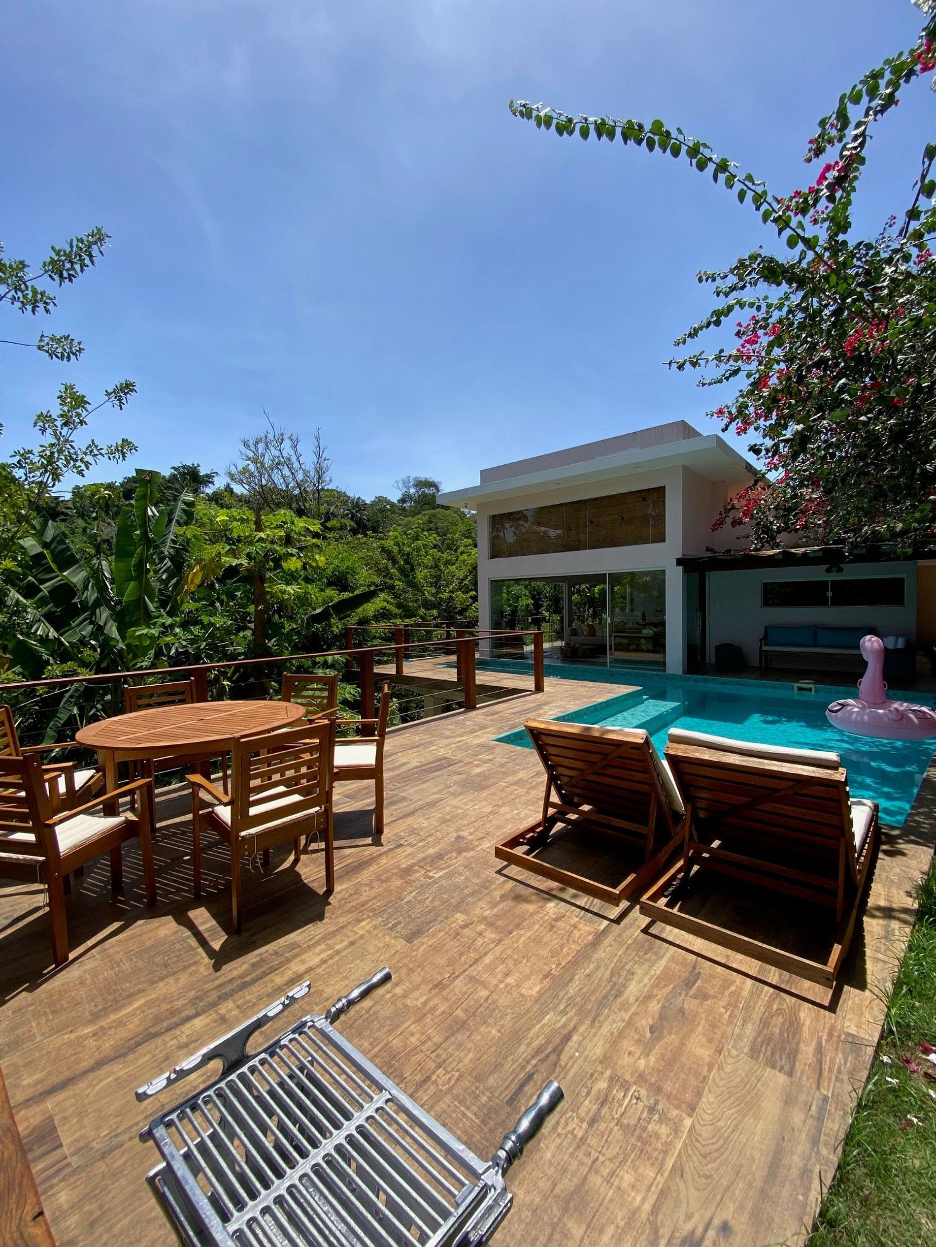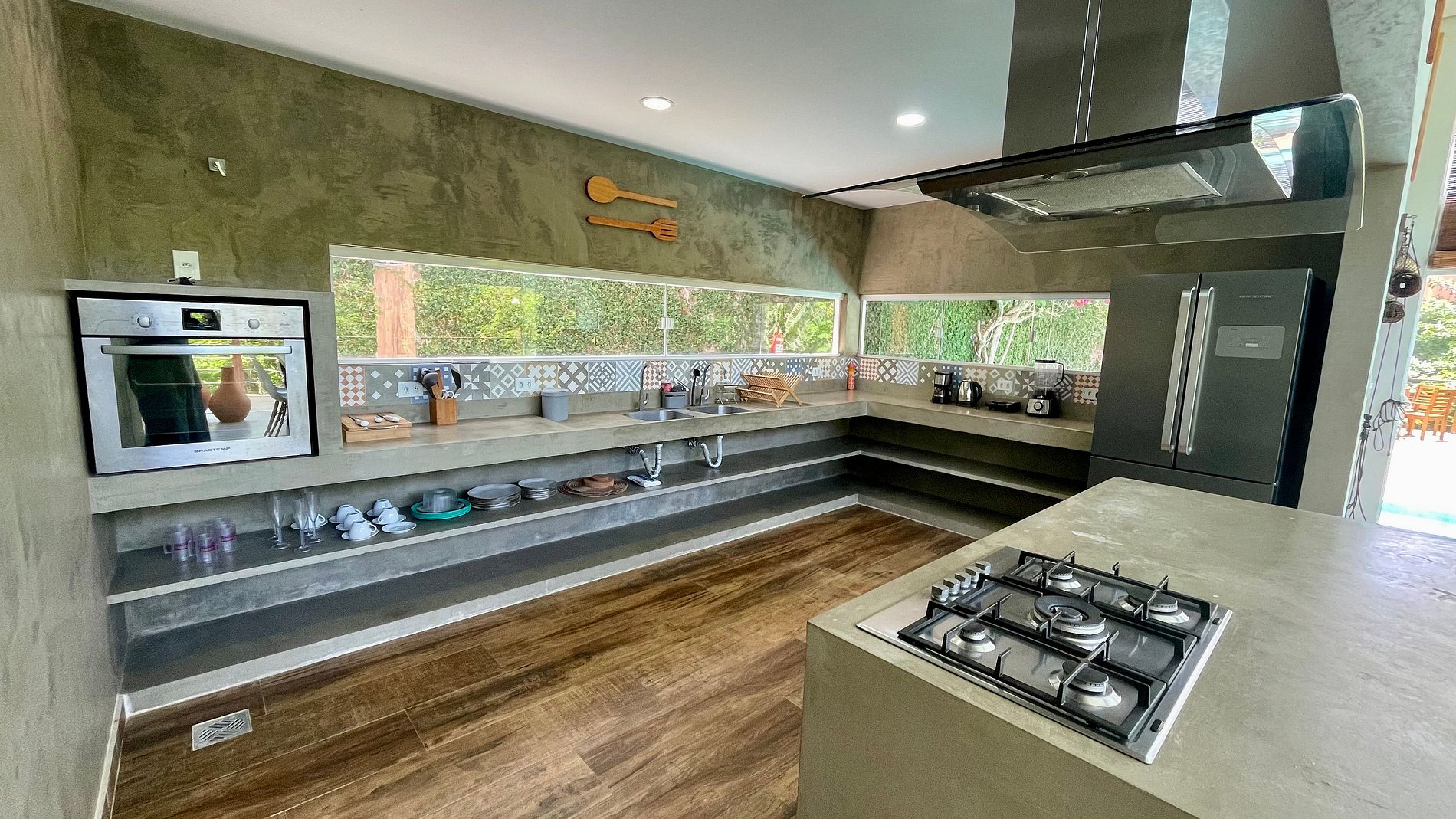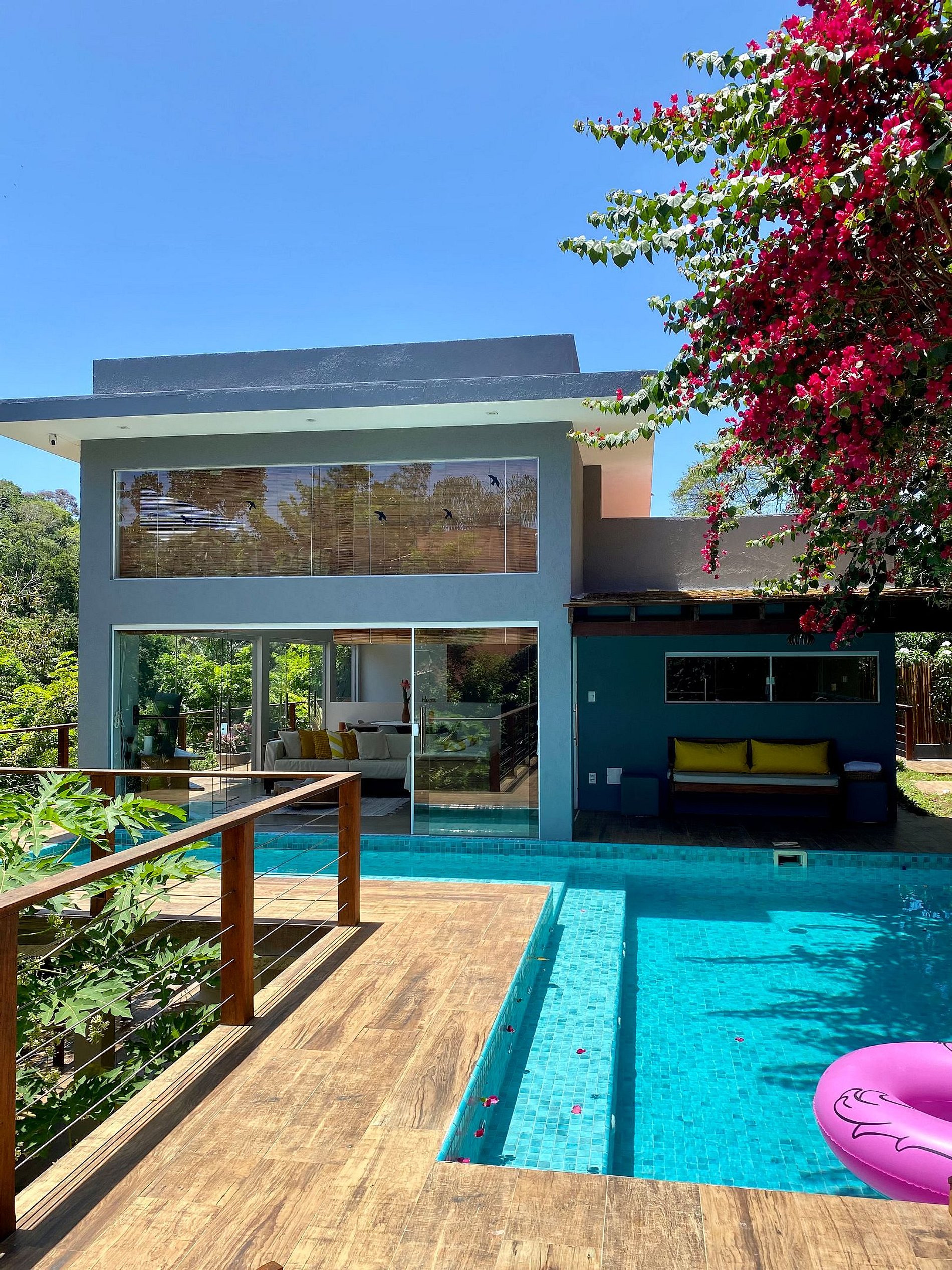 Imersa em uma área verde e bem ventilada, a casa possui três suítes com ar-condicionado, lavabo, cozinha em conceito aberto integrado com sala de jantar e estar, piscina e área de serviço. A casa de 2 andares conta com muita luz natural e foi projetada mesclando elementos rústicos a um estilo moderno.